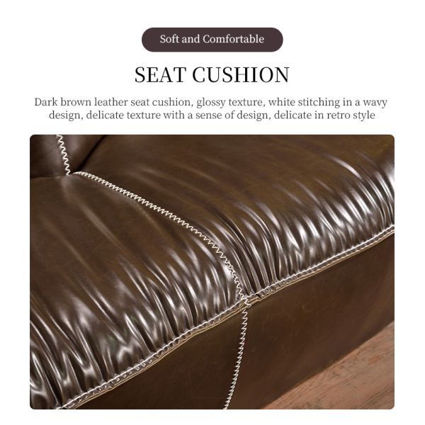 Dark brown leather armrest, integrated with the backrest in a rounded arc shape, exquisite white wavy stitching, glossy texture, retro and elegant with unique design sense.