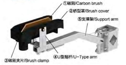 The current collectors are made of carbon brush,re-inforced nylon and galvanized or spray-paint metal material Spring loaded carbon brushes maintain uniform contact. Connecting cables and hinged or flexible towing arms included. Double collectors for transfer applications and higher amperage.
